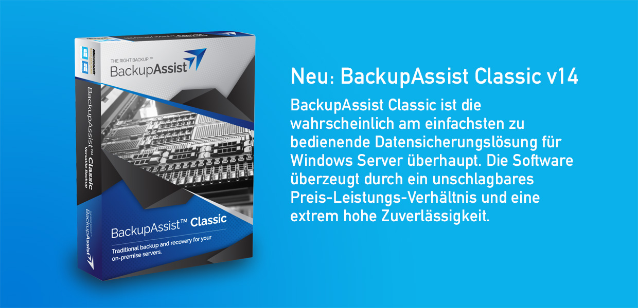 BackupAssist Classic ist eine zuverlässige und benutzerfreundliche Backup-Software, die speziell für kleine und mittelständische Unternehmen sowie öffentliche Einrichtungen entwickelt wurde. Sie bietet umfassende Funktionen zum Schutz von Windows-Servern oder Clients, und gewährleistet eine erfolgreiche Datenwiederherstellung im Falle von Cyberangriffen, Ransomware, Naturkatastrophen, Hardwareausfällen oder menschlichen Fehlern.